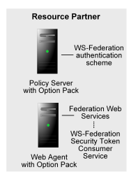 The WS-Federation authentication scheme is configured at the Resource Partner-side Policy Server and is invoked by the WS-Federation Security Token Consumer Service. The Security Token Consumer Service is a component of the Federation Web Services application and is installed on the Resource Partner-side Web Agent. This service obtains information from the WS-Federation authentication scheme at the Policy Server and uses that information to extract the necessary information from the assertion to authenticate a user.