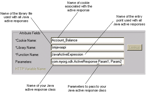The following diagram is an example of an active response configuration defined in the SiteMinder Response Attribute Editor. In the example, the active response is associated with a WebAgent-HTTP-Cookie-Variable attribute: