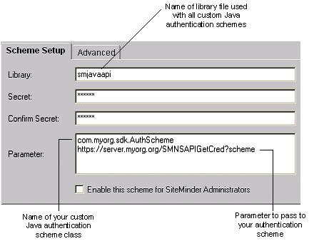 The following diagram is an example of an authentication scheme configuration defined on the SiteMinder Authentication Scheme Dialog. The Authentication Scheme Type is Custom Template: