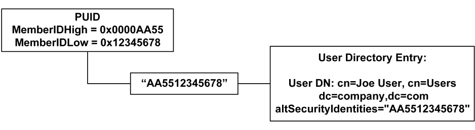The PUID is converted to a string and is mapped to a SiteMinder identity through a user directory attribute. In the following diagram, the user DN for "Joe User" is mapped to a Passport PUID through the directory attribute "altSecurityIdentities".