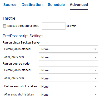 The Advanced tab lets you specify some advanced settings for the backup job. The advanced settings include providing the backup throughput and pre/post script settings.
